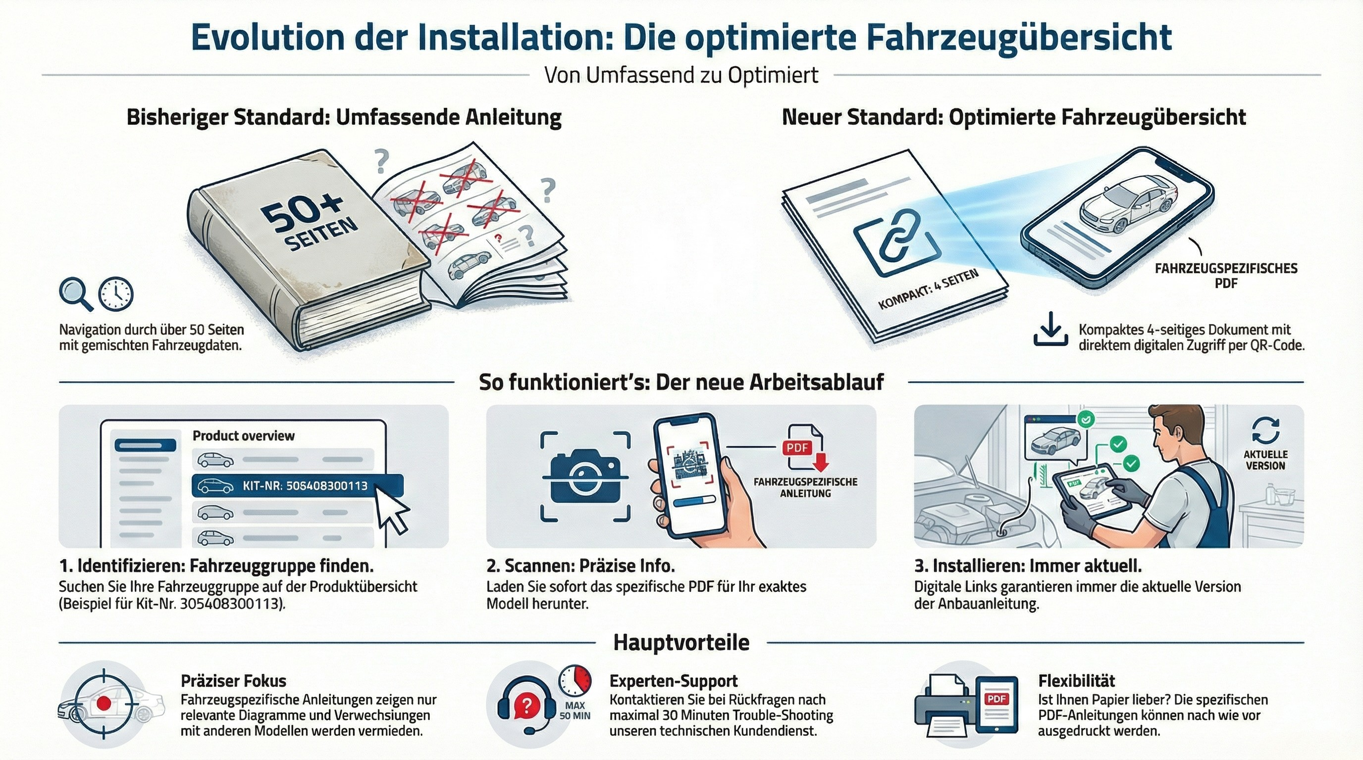 Unsere Elektrosätze sind seit Jahren ein bewährter Favorit in der Werkstatt – und nun heben wir das Installationserlebnis mit unserer neuen, kompakten Fahrzeugübersicht auf ein neues Niveau. Statt umfangreicher Handbücher mit über 50 Seiten im Karton verfolgen wir einen modernen, Digital-First-Ansatz.