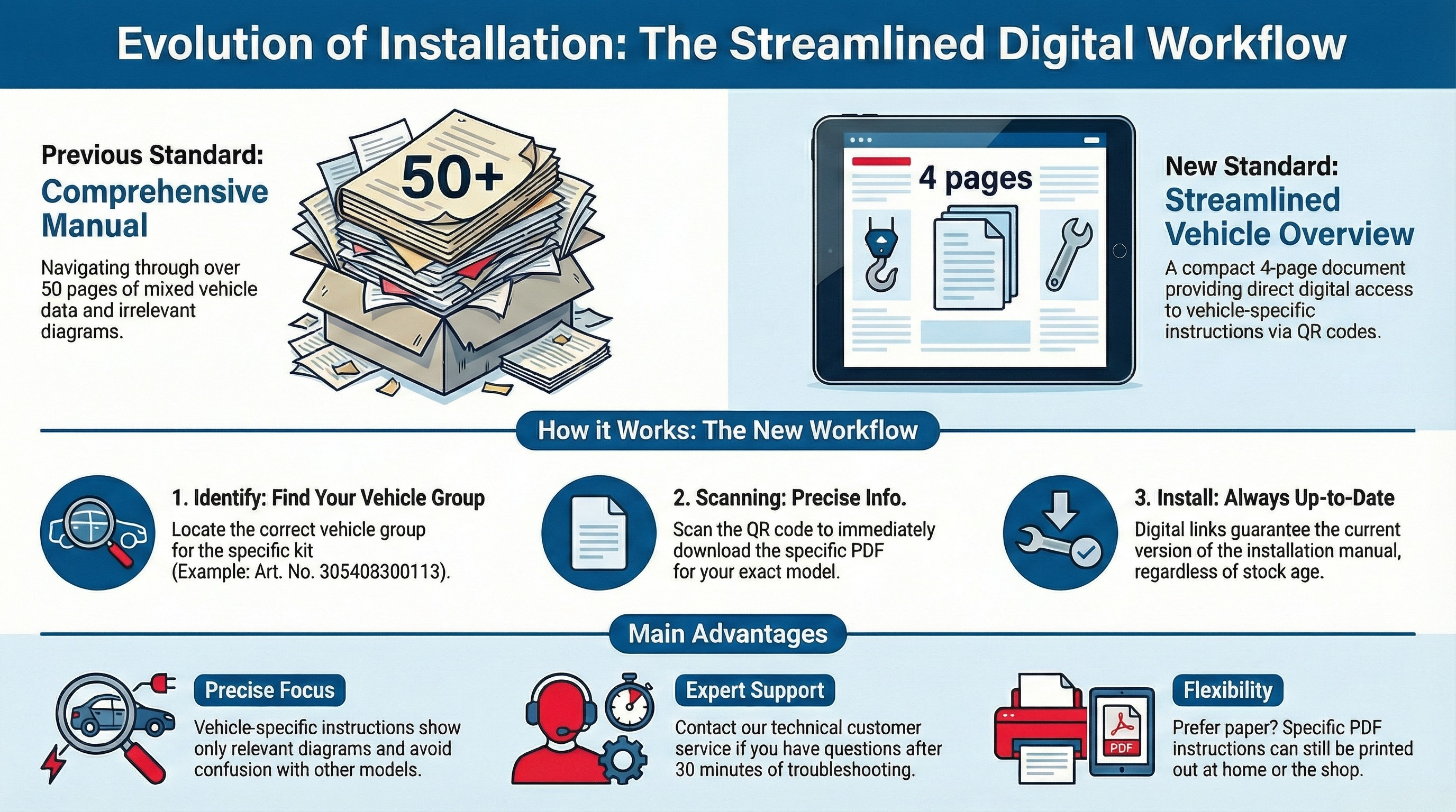 Our electrical kits have long been a trusted favourite in workshops, and we are now elevating the installation experience to a new level with our streamlined vehicle overview. We are transitioning from extensive 50+ page manuals to a modern, digital-first approach.